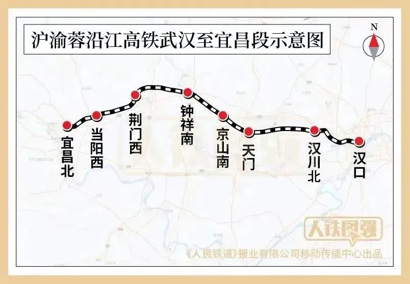 沿江高铁武宜段位于湖北省境内,起自武汉市,经天门市、荆门市,终至宜昌市,正线全长313公里,设计时速350公里,设汉口(既有)、汉川北、天门、京山南、钟祥南、荆门西、当阳西、宜昌北8座车站,桥隧占比85%,于2021年9月25日开工建设。