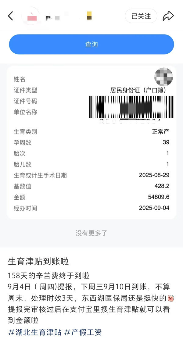 蔡甸区的宝妈“小俐”也于9月4日收到20244.51元的生育津贴,她向记者分享道:“本来还担心流程复杂、到账慢,没想到这么方便、速度这么快!9月1日我在手机上提交申请,一小时就审核通过,四天钱就到账了,体验特别棒!”