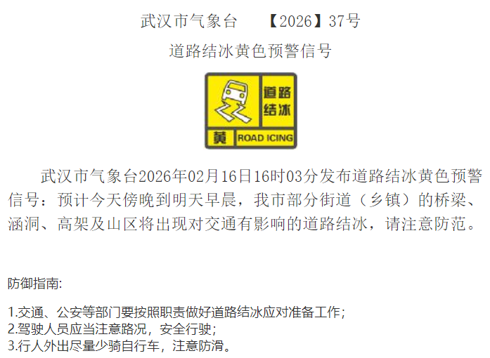 不过,美好之外,也请大家注意出行安全。16日下午,武汉市气象台发布道路结冰黄色预警信号:预计除夕夜至初一早上,武汉部分地区的桥梁、涵洞、高架桥及山区,将出现影响交通出行的道路结冰,请大家注意防寒防滑。