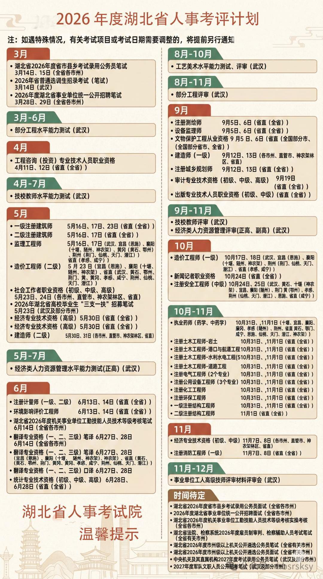 湖北事业单位招聘考试、公务员考试等时间