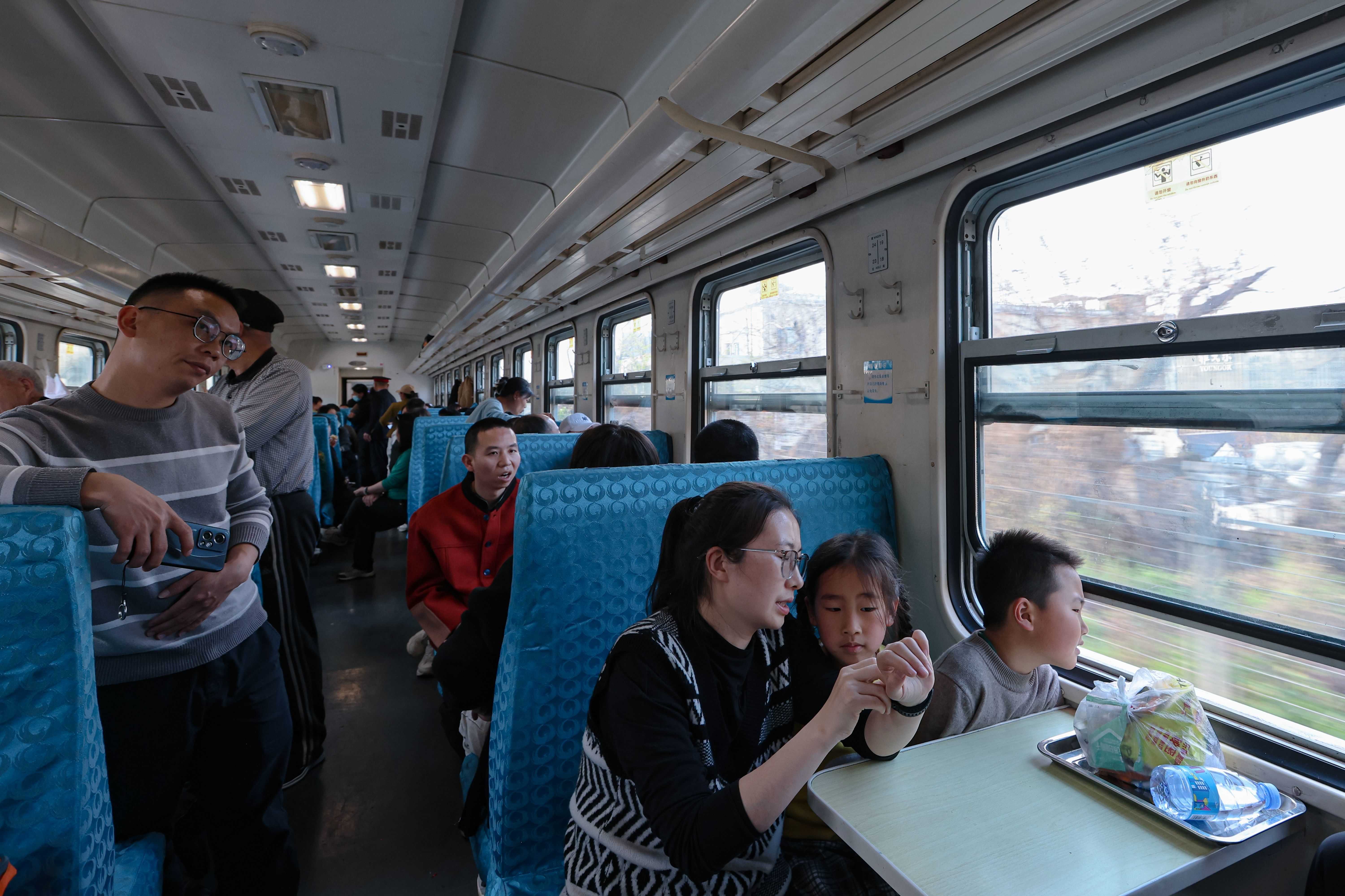 “武汉东至武汉东”普速环线列车途经黄鹤楼、长江大桥、晴川阁、龟山电视塔等经典地标,既为跨江通勤的市民提供新选择,也为市民游客打卡武汉 “网红线路”服务。旅客乘坐5878次、5888次环线列车夜间通过武汉长江大桥,既可欣赏江城夜景,还能看长江两岸灯光秀。绿皮火车复古的墨绿色车身、连体硬座、蓝色座椅套、装垃圾的铝托盘等,哐当哐当的声响给人复古的感觉,给游客带来不一样的体验。