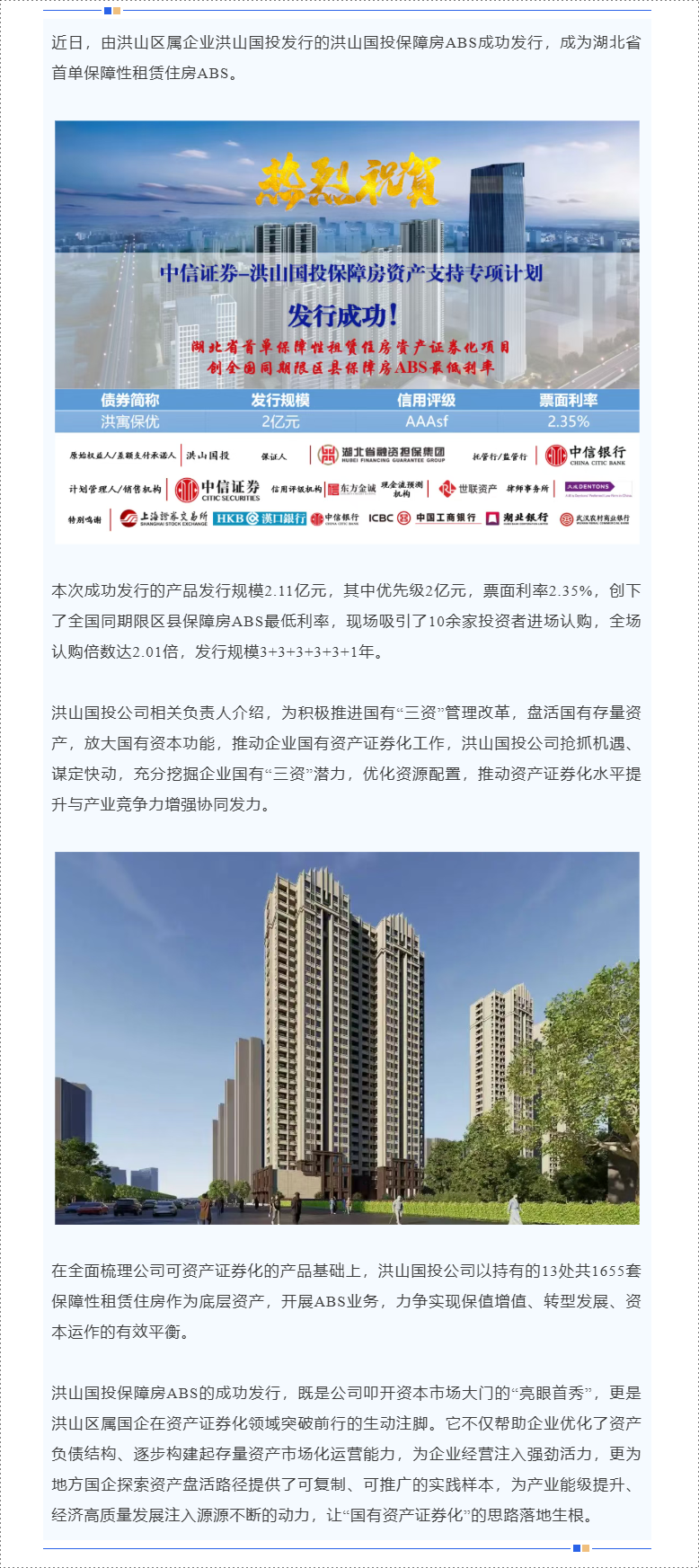 湖北省首单保障性租赁住房ABS!洪山国投成功发行