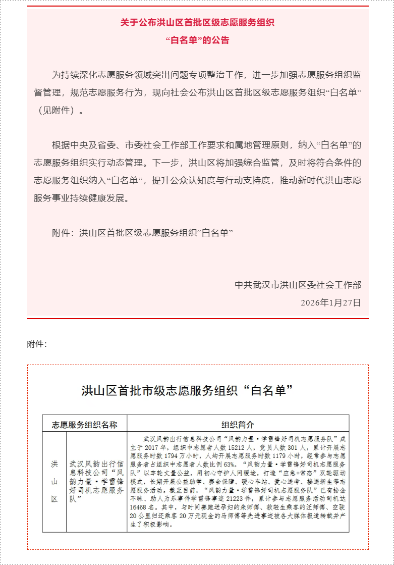 关于公布洪山区首批区级志愿服务组织“白名单”的公告