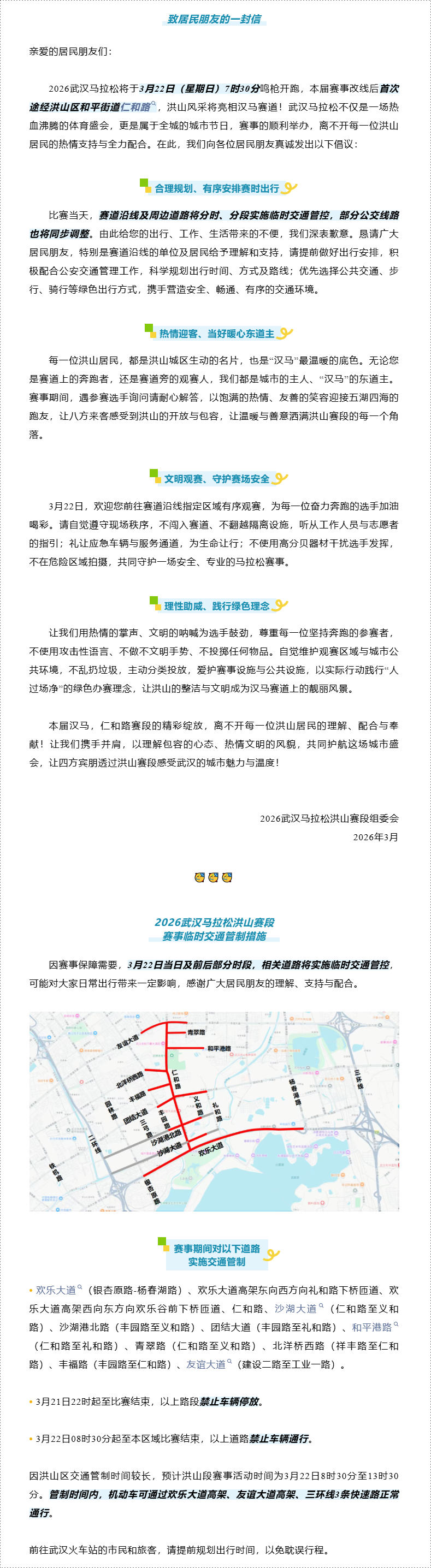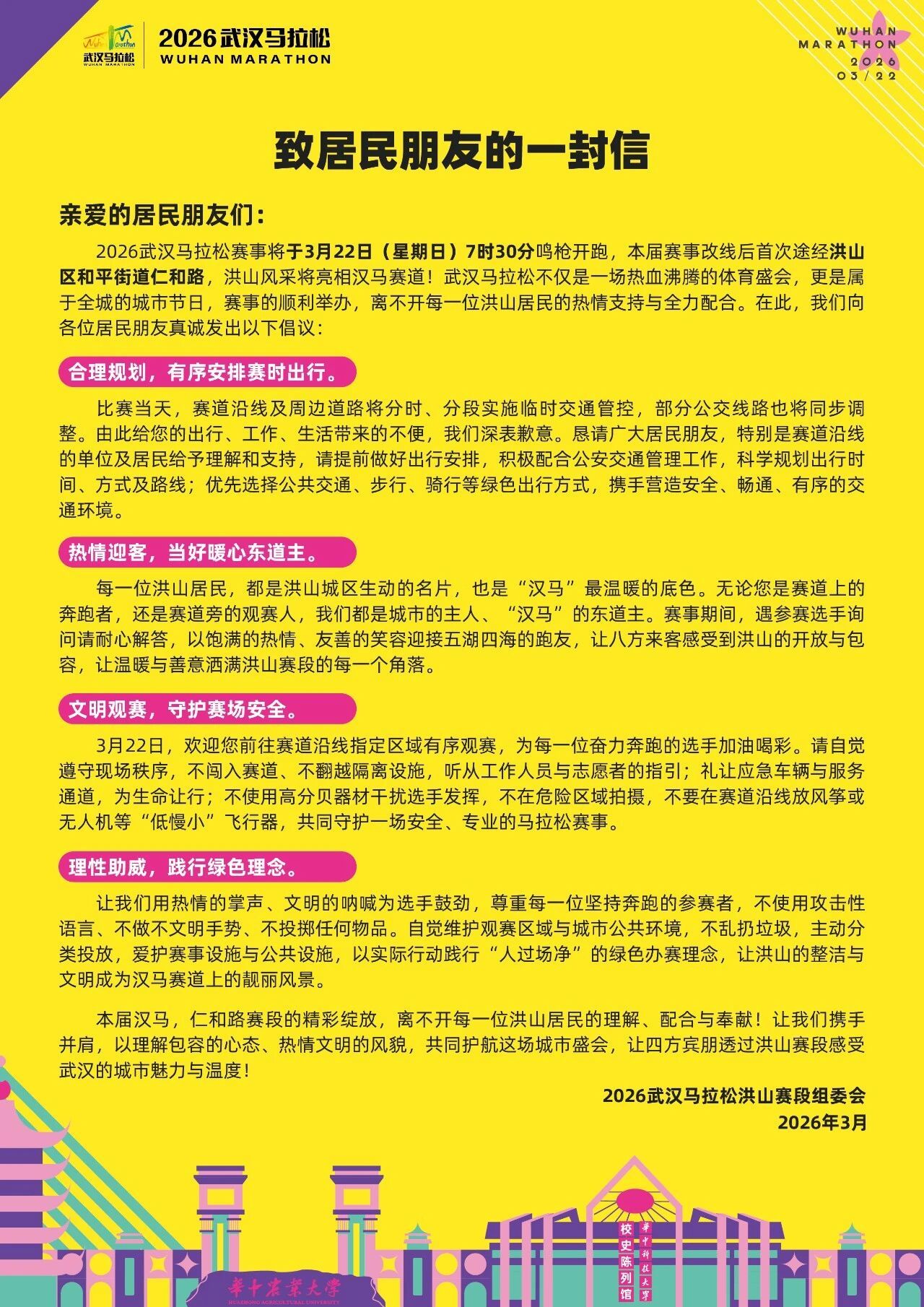 汉马周末开跑,这封信洪山居民朋友请查收!