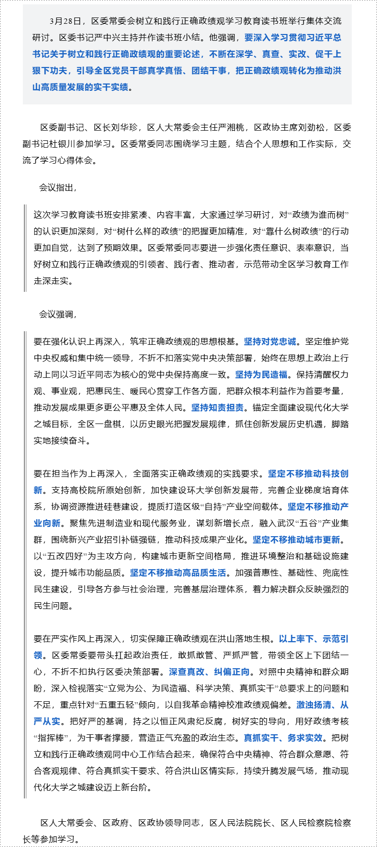 区委常委会树立和践行正确政绩观学习教育读书班举行集体交流研讨