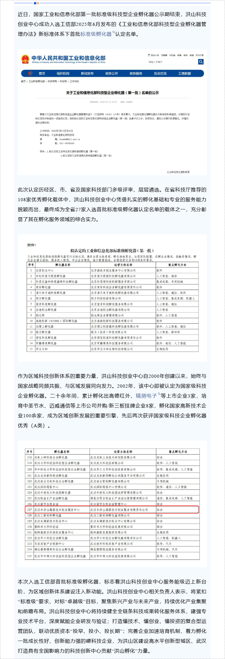 洪山科技创业中心入选国家工信部首批标准级孵化器