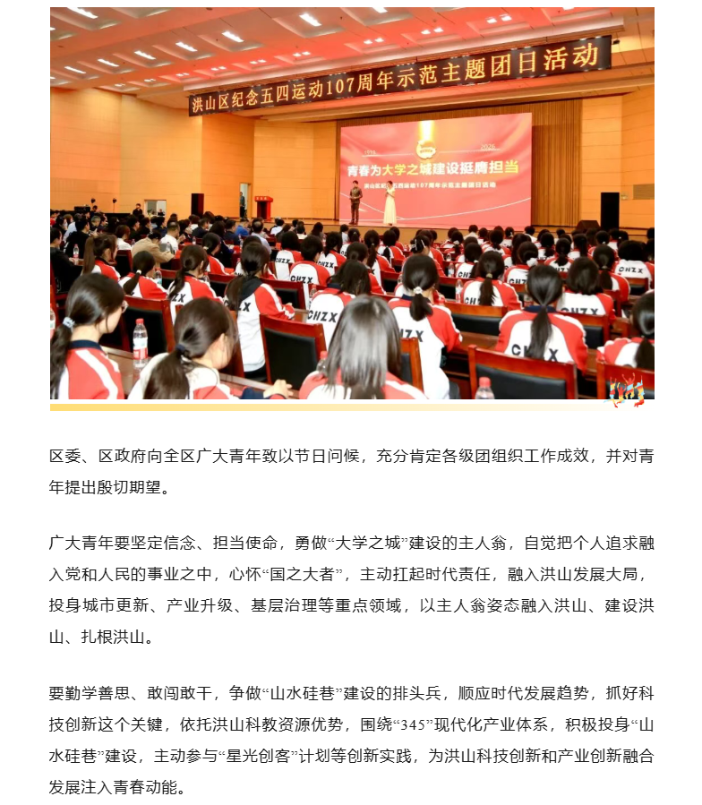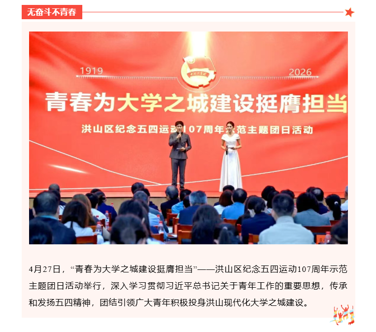 青春为大学之城建设挺膺担当 洪山区纪念五四运动107周年示范主题团日活动举行