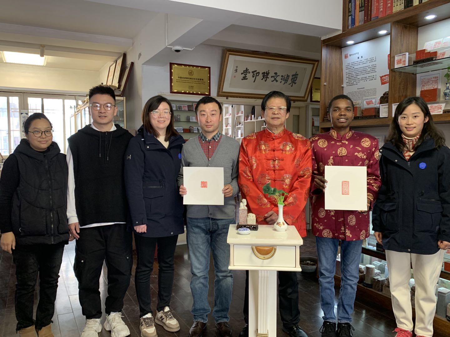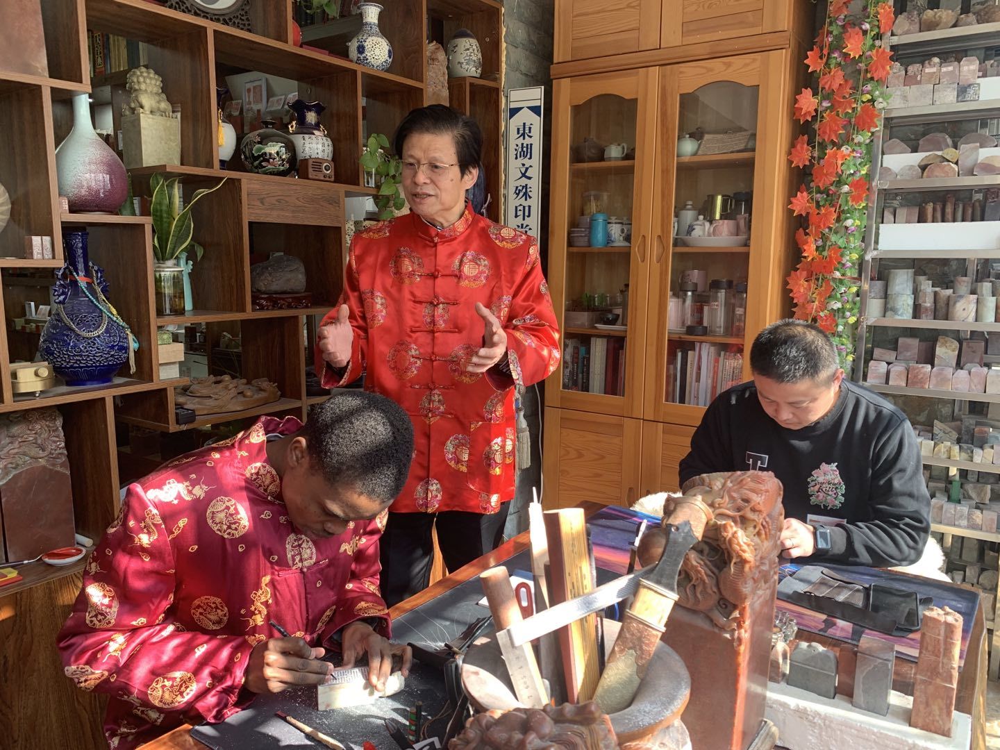 东湖文殊印堂工作室的主理人宋斌教授介绍,莫德是来自莫桑比克的国际经济与贸易专业的留学生,他从2017年开始选修《中国篆刻艺术》这门课,学习篆刻已快5年了,他不仅中文流利,也特别喜爱中国的文化。宋斌教授向大家简单介绍了“冬至”习俗和由来,莫德告诉长江日报的记者,他说他知道中国人在冬至这一天要吃饺子,穿上新装,所以今天他第一次穿上唐装,觉得自己很帅。当被问及新年的愿望时,莫德说,他希望更多的留学生学习篆刻艺术,也希望大家在新的一年身体健康。