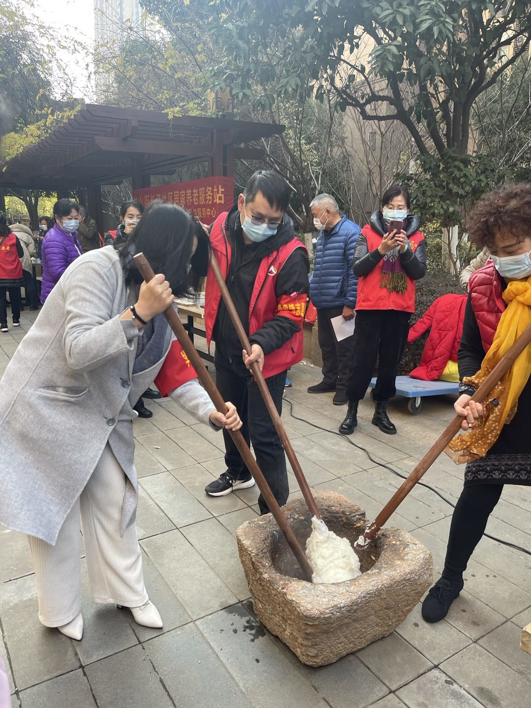 体验手工打糍粑。糍粑由糯米蒸熟再通过特质的石材凹槽冲打而成,大家你一摞我一摞,轮番上阵,围观的居民兴奋无比,加油助威声此起彼伏,在这个冬至节日里,一起其乐融融的打糍粑,体验糍粑的打制过程,分享品尝糍粑成果,都觉得特别的开心。
