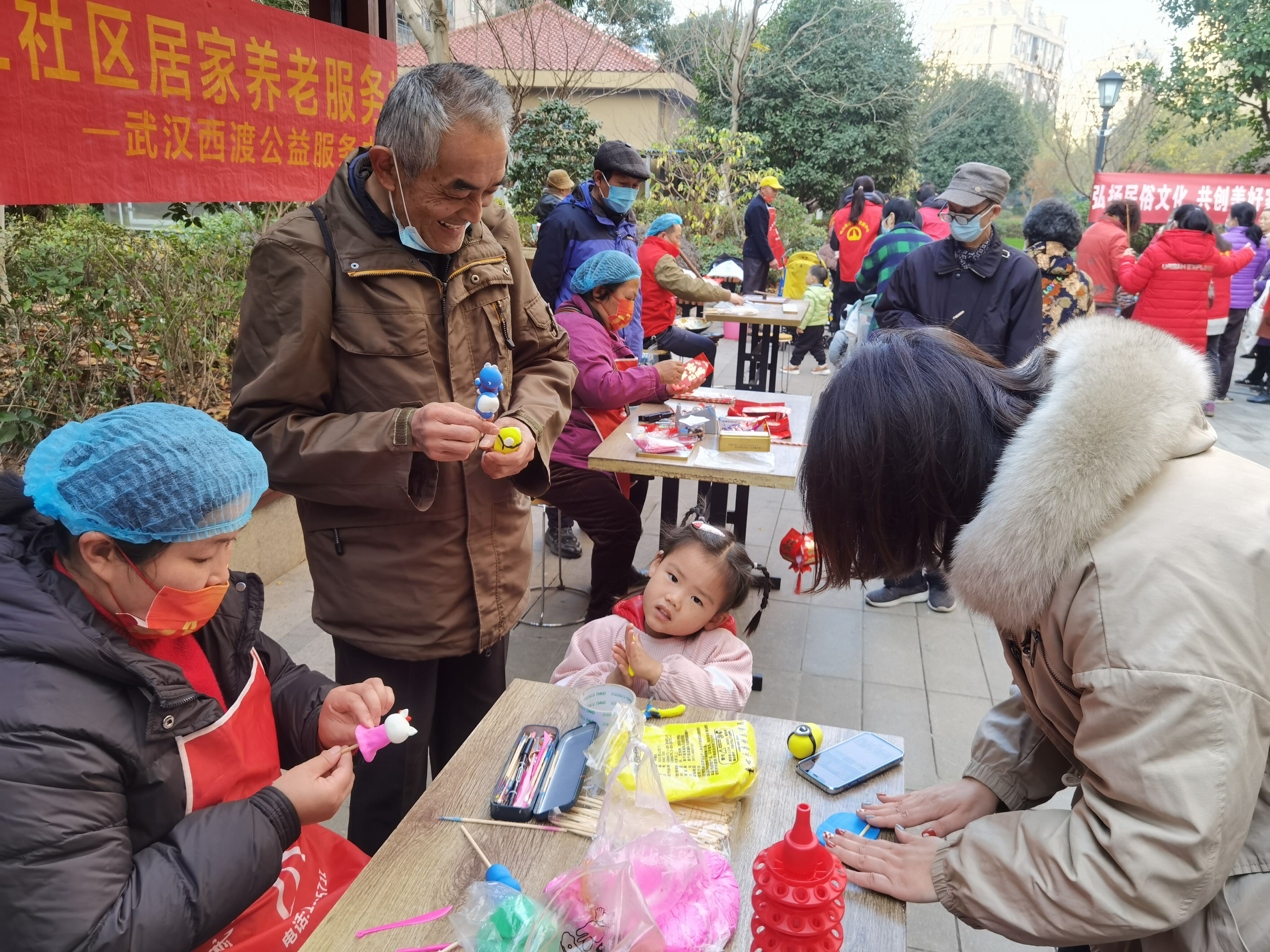 12月21日上午,长江社区联合西渡公益在曙光星城C区文化小广场开展了“弘扬民俗文化 共创美好家园”主题文化活动,组织党员群众一道画糖人、捏面人、打糍粑、做灯笼,现场氛围热烈,党员群众其乐融融。