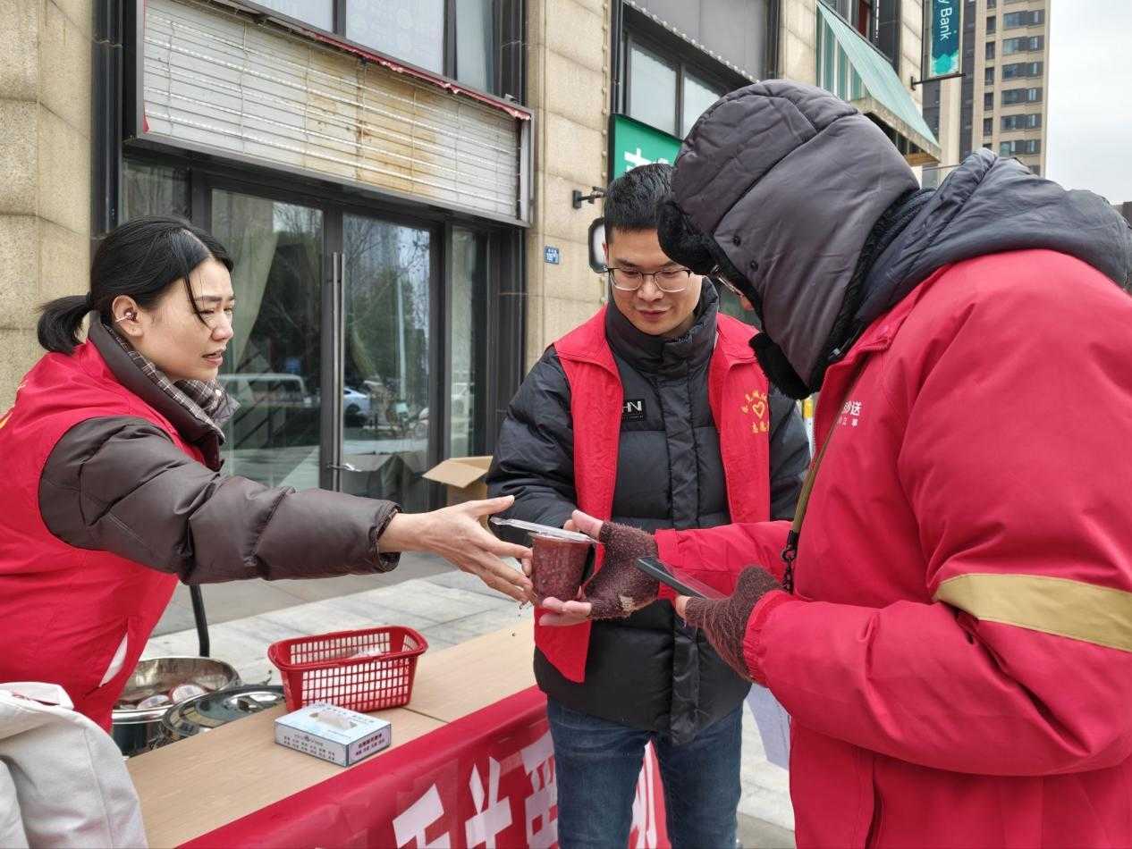 活动现场,社区工作人员与志愿者提前布置好服务专区,将暖心物资与安全宣传资料整齐陈列。针对冬季户外作业的寒冷天气与干燥环境,社区为每位参与者准备了“保暖防护礼包”,内含加厚防滑手套、大容量保温杯与保湿护手霜,从手部保暖到日常补水全方位呵护户外工作者的健康;志愿者们准备的软糯黑米粥热气腾腾,一杯杯热饮递到手中,瞬间驱散了冬日寒意。