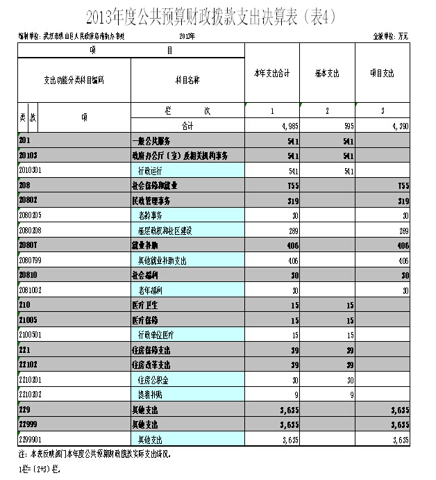 武汉市洪山区人民政府珞南街办事处2013年公共预算财政拨款支出年度预算为4,985万元(包括年初部门预算、基本建设资金、上级下达的专项转移支付资金及年初结转和结余资金等支出),支出决算为4,985万元,完成年度预算的100%。其中:基本支出 595万元,主要是退休人员工资270万元,在职职工工资276万元,公用经费49万元。项目支出4,390万元,主要用于老龄事务30万元,提高了老年人的生活质量;基层政权和社区建设289万元,使社区环境得到了改善丰富了社区文化生活,保证了社区工作正常运转;其他就业补助支出406万元,使社区就业率大大提高,劳动就业得到了保障;老年福利30万元,增加了老年人的生活幸福指数;其他支出3635万元,使各项工作得以顺利完成,环境得到了整治和美化,安全得到保障,治安进一步提高,居民生活更加稳定。