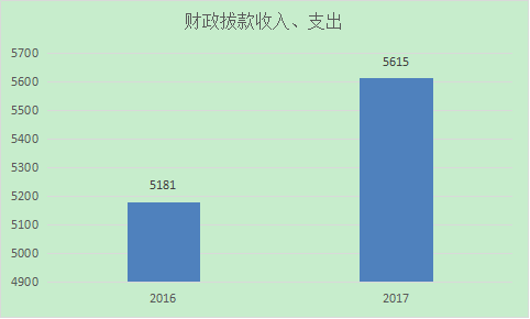 2017年度财政拨款收、支总计5,615万元。与2016年相比,财政拨款收、支总计各增加434万元,增长8.4%。主要原因是增加公共安全支出、社会保障和就业支出、城乡社区支出、商业服务业支出及其他支出。