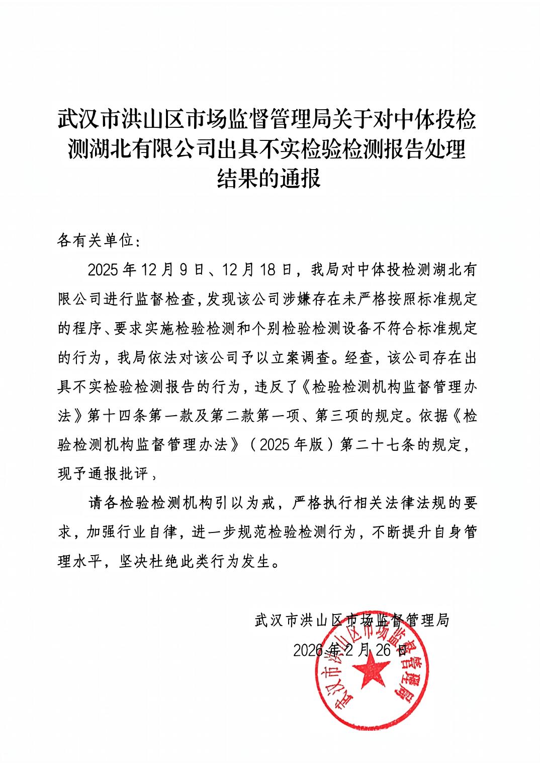 对中体投检测湖北有限公司出具不实检验检测报告处理结果的通报