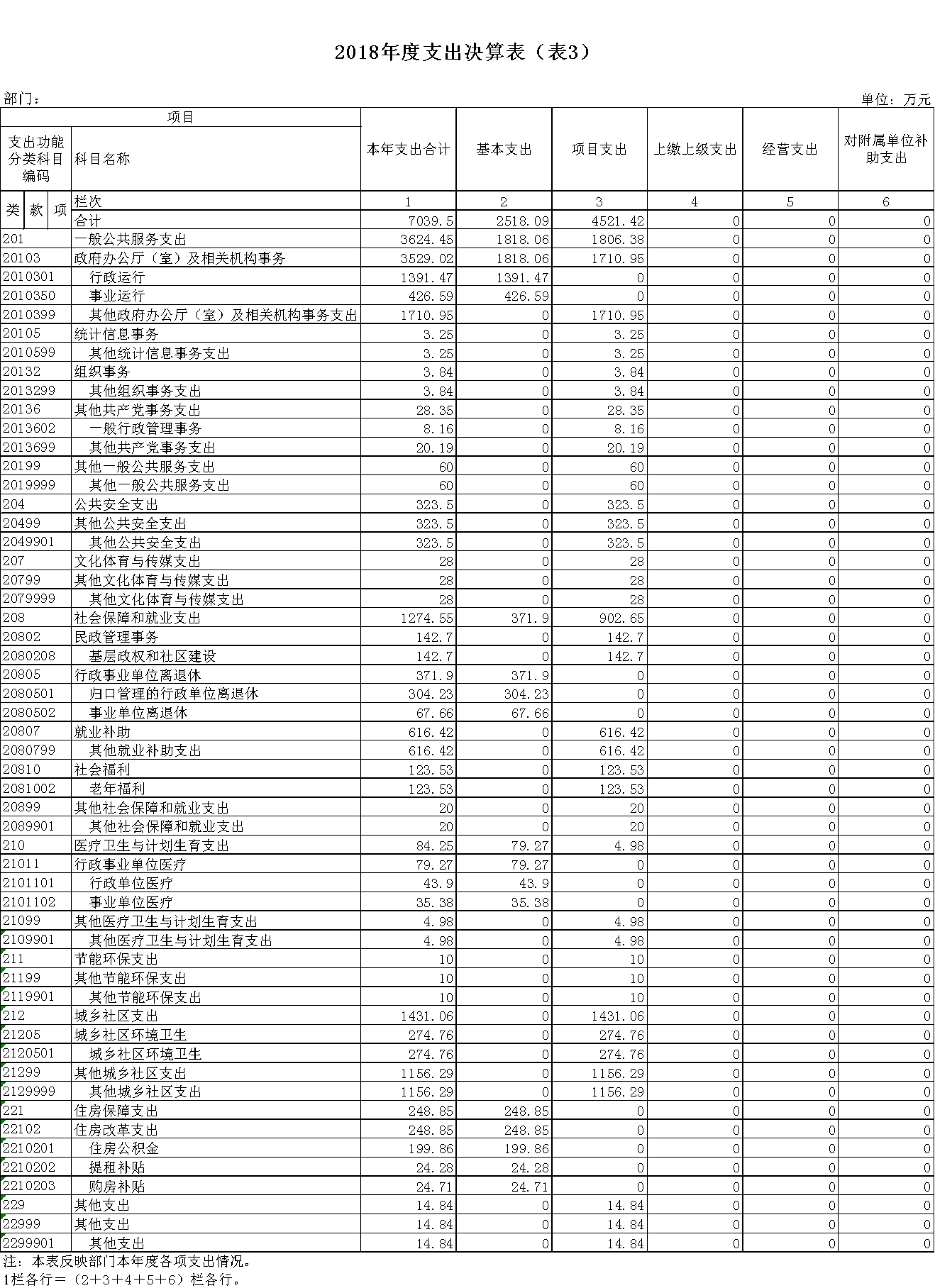 2018年度本年支出合计7039.50万元。其中:基本支出2518.09万元,占本年支出35.77%;项目支出4521.41万元,占本年支出64.23%;上缴上级支出0万元,占本年支出0.00%;经营支出0万元,占本年支出0.00%;对附属单位补助支出0万元,占本年支出0.00%。