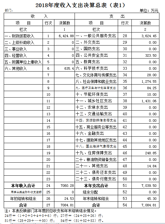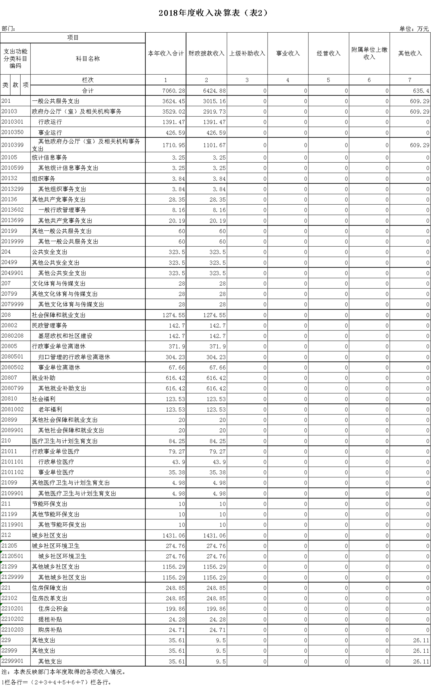 2018年度本年收入合计7060.28万元。其中:财政拨款收入6424.88万元,占本年收入91%;其他收入635.40万元,占本年收入9%;上级补助收入、事业收入、经营收入、附属单位上缴收入均为0万元。