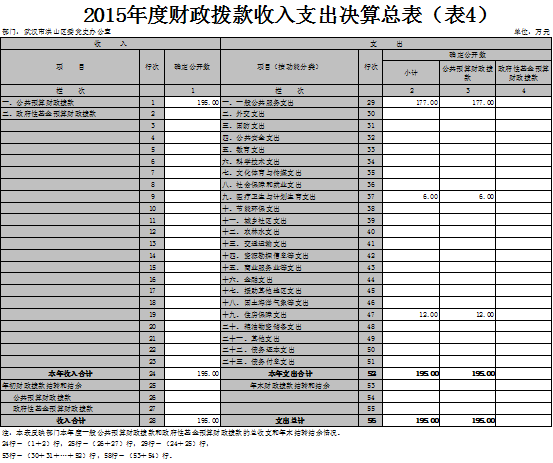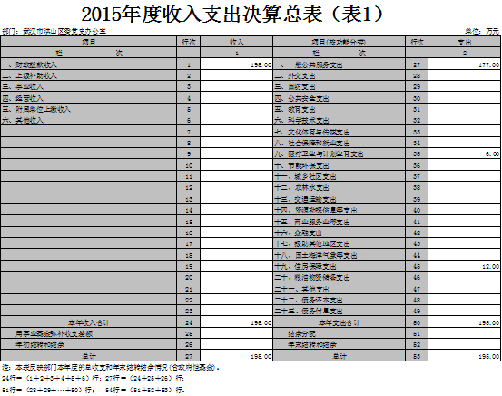 2015年度收入总计195万元,支出总计195万元。与2014年相比,收入增加13万元,增长7%,主要原因是基本支出中在职及离退休人员经费的增长。支出增加13万元,增长7%,主要原因是基本支出中在职及离退休人员经费的增长。
