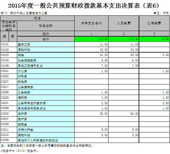 2015度一般公共预算财政拨款基本支出178万元,其中,人员经费171万元,主要包括:基本工资、津贴补贴、奖金、社会保障缴费、绩效工资、其他工资福利支出、离休费、退休费、抚恤金、退职(役)费、抚恤金、生活补助、救济费、医疗费、助学金、奖励金、生产补贴、住房公积金、提租补贴、购房补贴、其他对个人和家庭的补助支出;公用经费6万元,主要包括:办公费、印刷费、咨询费、手续费、水费、电费、邮电费、取暖费、物业管理费、差旅费、因公出国(境)费、维修(护)费、租赁费、会议费、培训费、公务接待费、专用材料费、被装购置费、专用燃料费、劳务费、委托业务费、工会经费、福利费、公务用车运行维护费、其他交通费用、税金及附加费用、其他商品和服务支出;基本建设和其他资本性支出1万元,主要包括:房屋建筑构建费、办公设备购置、专用设备购置、基础设施建设、大型修缮、信息网络及软件购置更新、物资储备、土地补偿、安置补助、地上附着物和青苗补助、拆迁补偿、公务用车购置、其他交通工具购置、其他基本建设和资本性支出。
