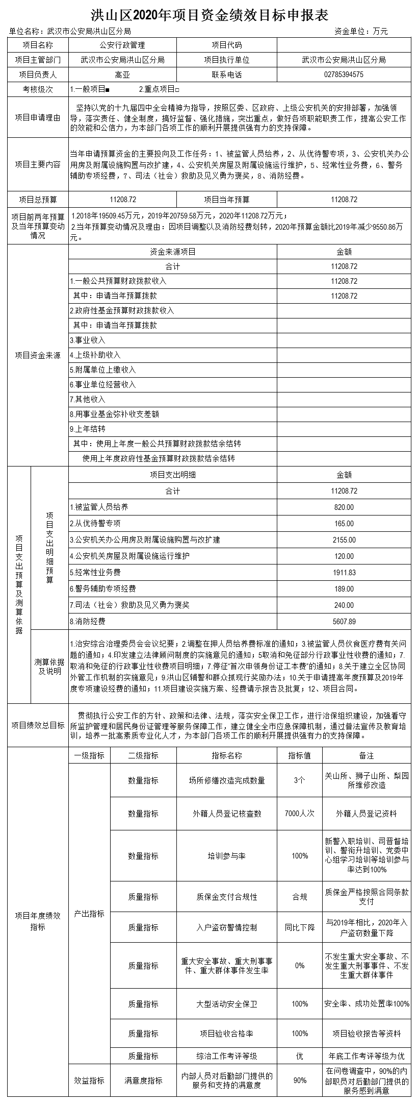 名 称:武汉市公安局洪山区分局2020年公安行政管理项目资金绩效目标申报表