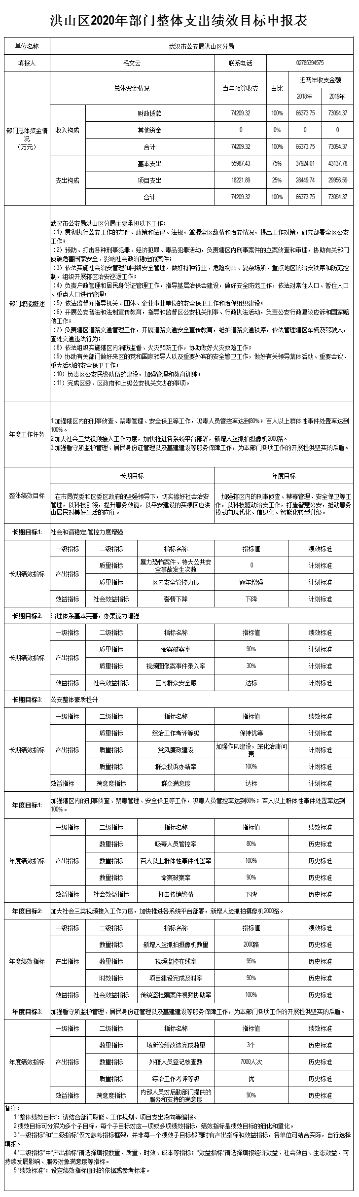 名 称:武汉市公安局洪山区分局2020年部门整体支出绩效目标申报表