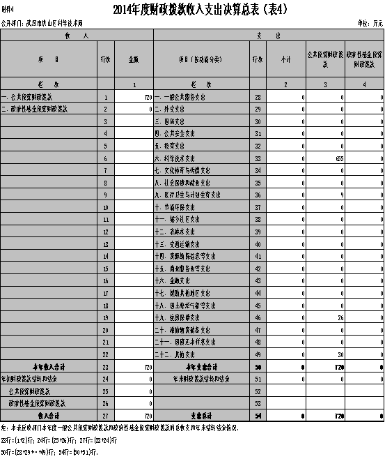 武汉市洪山区科学技术局2014年度本年收入合计720万元。其中:财政拨款收入(含政府性基金拨款) 720万元,占本年收入100%。