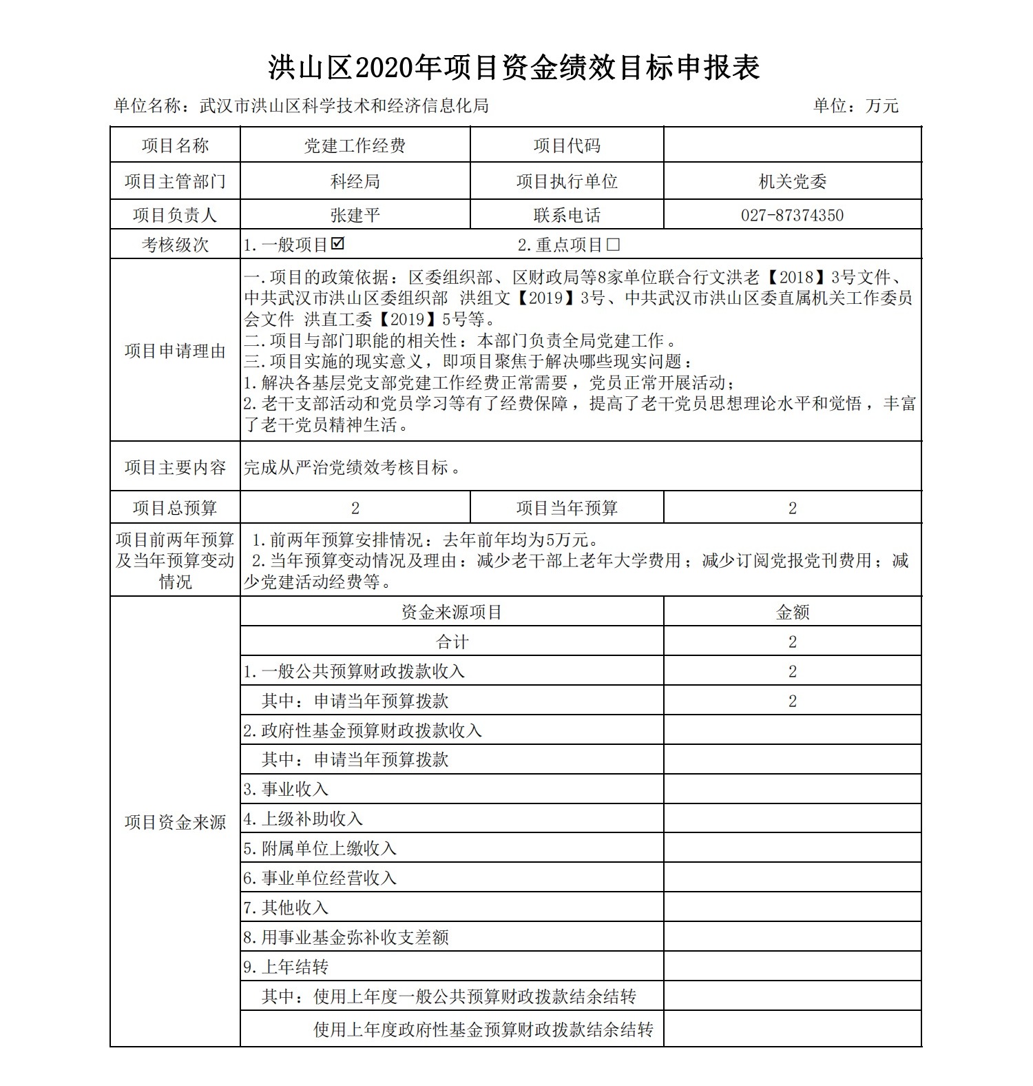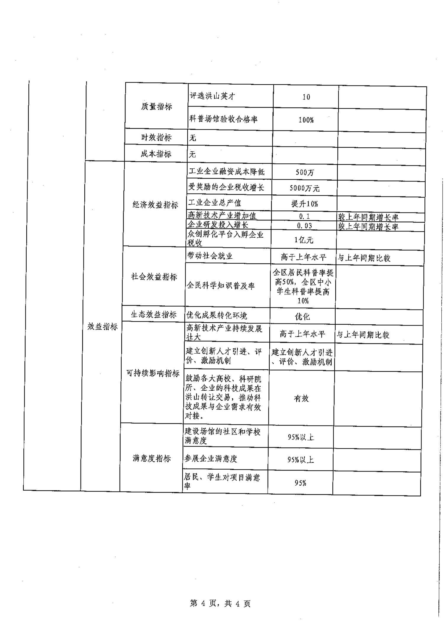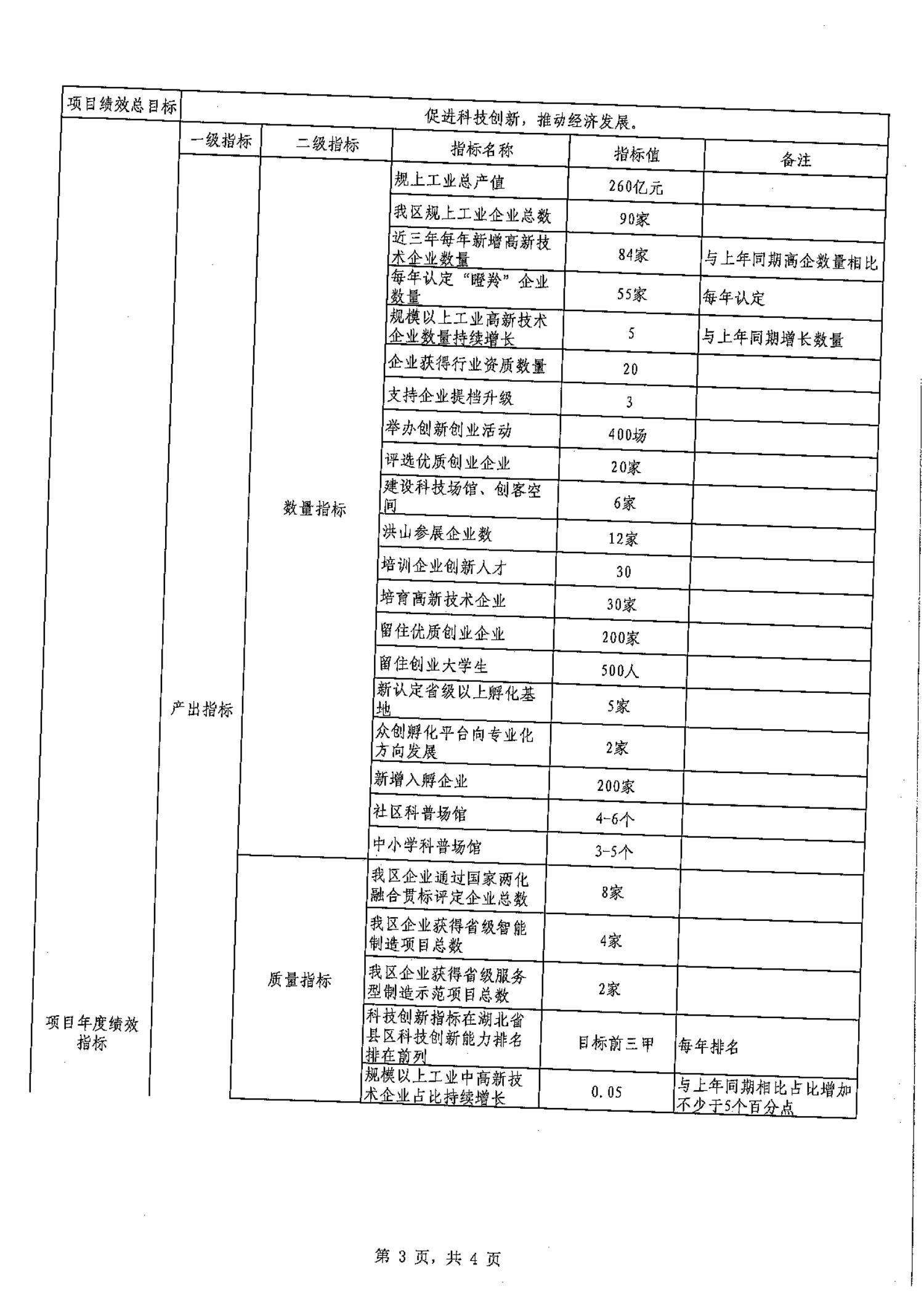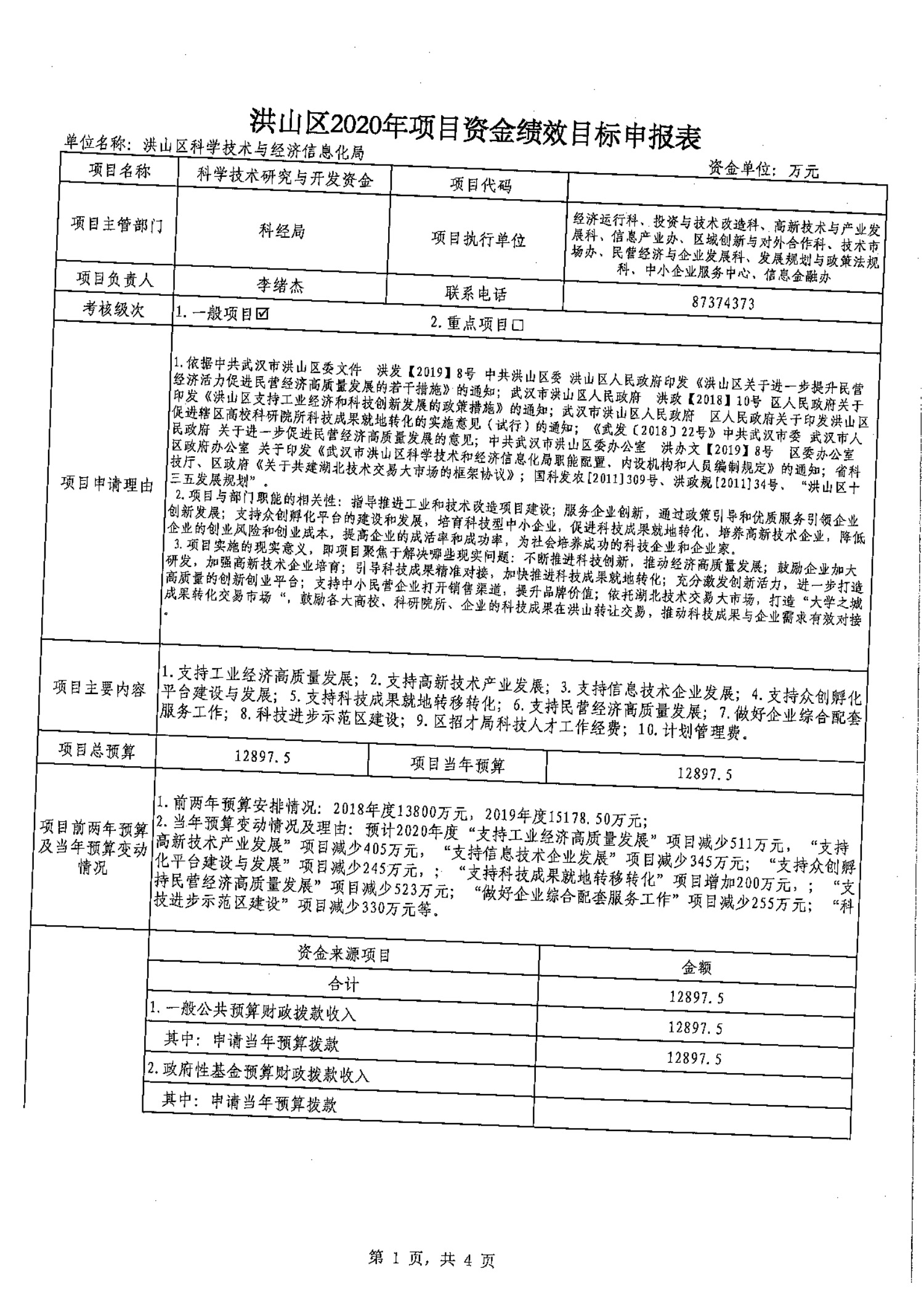 名 称:洪山区科学技术和经济信息化局2020年项目资金绩效目标申报表