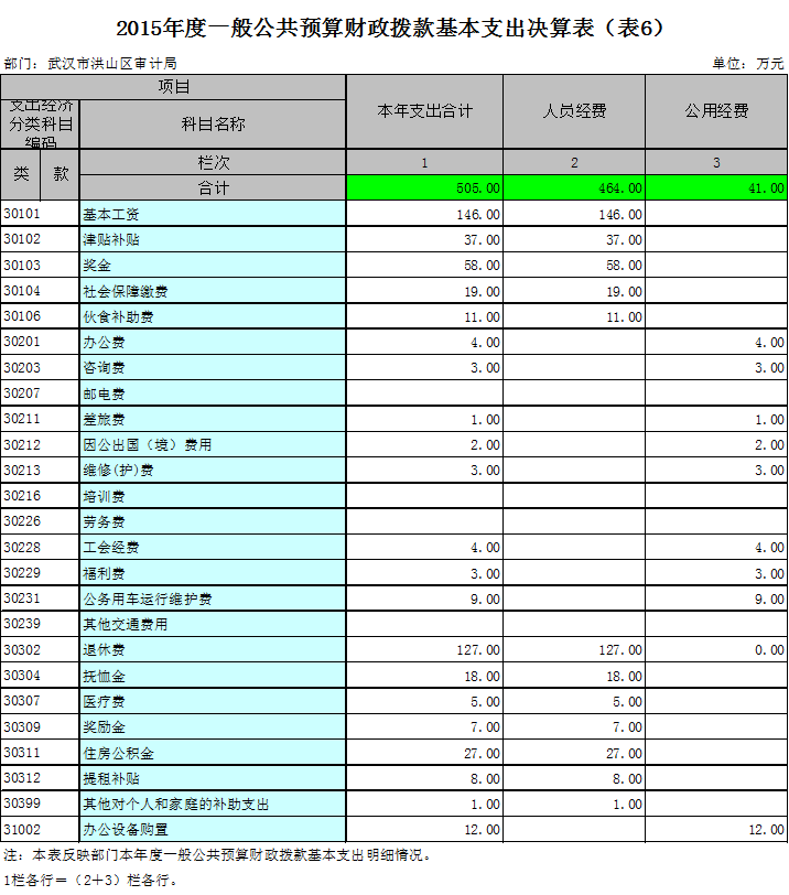2015度一般公共预算财政拨款基本支出505万元,其中,人员经费464万元,主要包括:基本工资、津贴补贴、奖金、社会保障缴费、绩效工资、其他工资福利支出、离休费、退休费、抚恤金、退职(役)费、抚恤金、生活补助、救济费、医疗费、助学金、奖励金、生产补贴、住房公积金、提租补贴、购房补贴、其他对个人和家庭的补助支出;公用经费41万元,主要包括:办公费、印刷费、咨询费、手续费、水费、电费、邮电费、取暖费、物业管理费、差旅费、因公出国(境)费、维修(护)费、租赁费、会议费、培训费、公务接待费、专用材料费、被装购置费、专用燃料费、劳务费、委托业务费、工会经费、福利费、公务用车运行维护费、其他交通费用、税金及附加费用、办公设备购置。