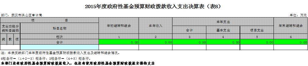 武汉市洪山区审计局2015年没有政府性基金预算财政拨款收入,也没有使用政府性基金预算财政拨款安排的支出。