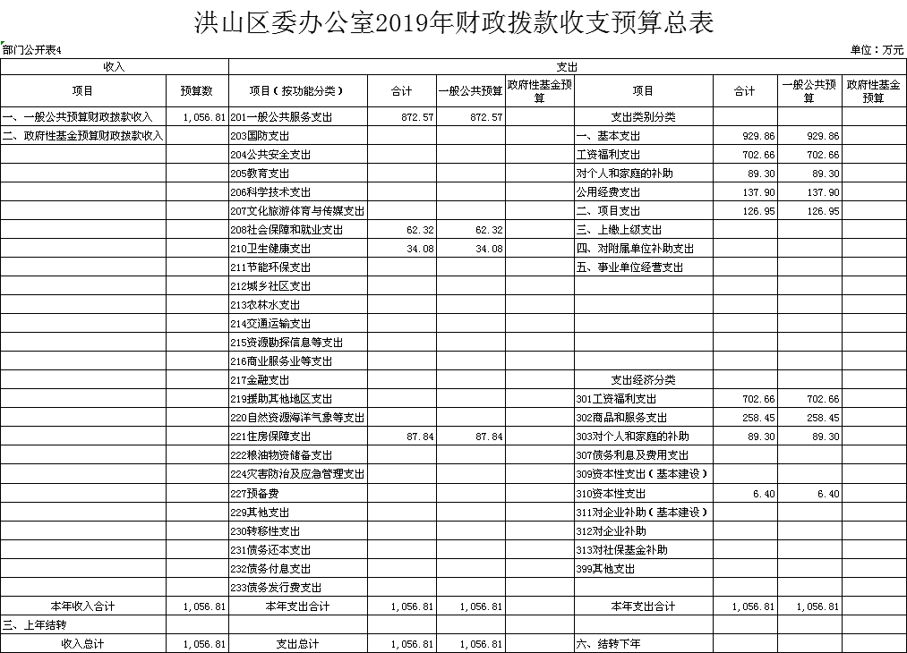 名 称:洪山区委办公室2019年财政拨款收支预算总表