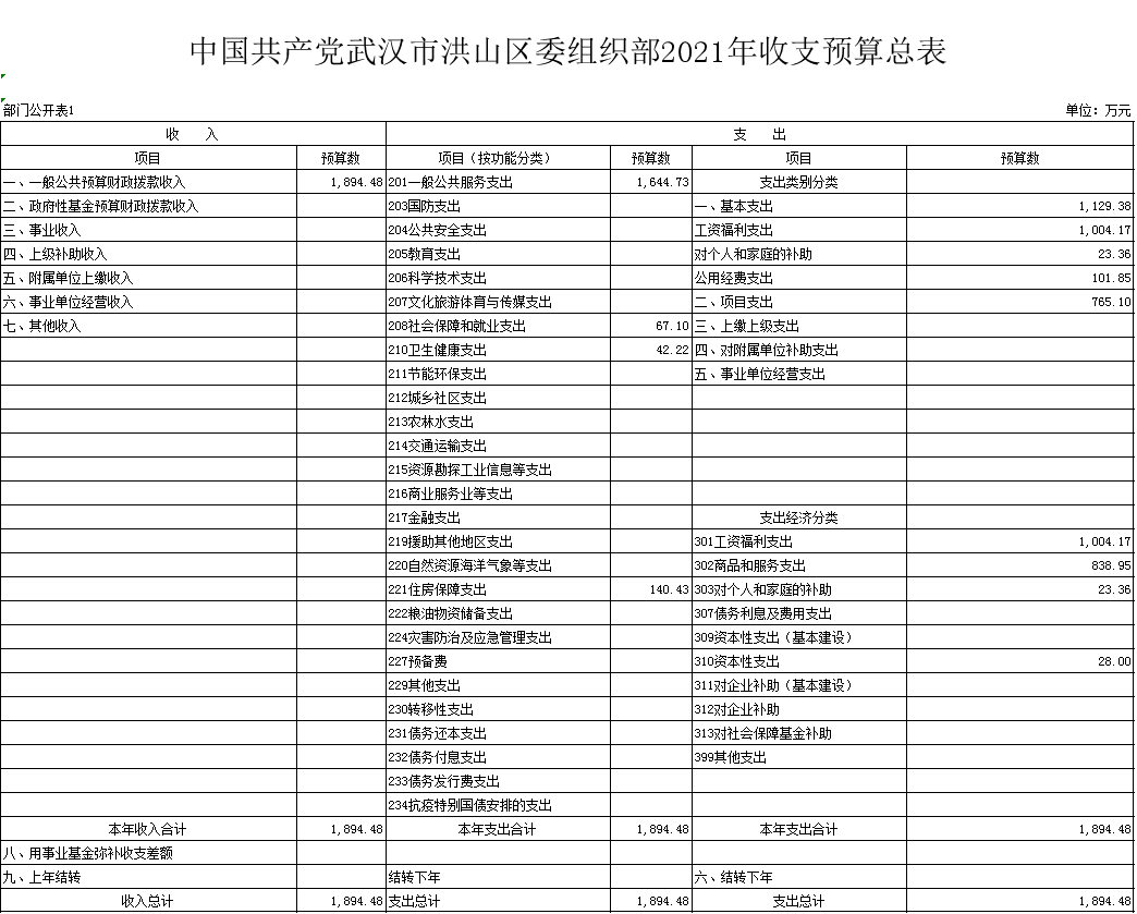 名 称:中国共产党武汉市洪山区委组织部2021年收支预算总表