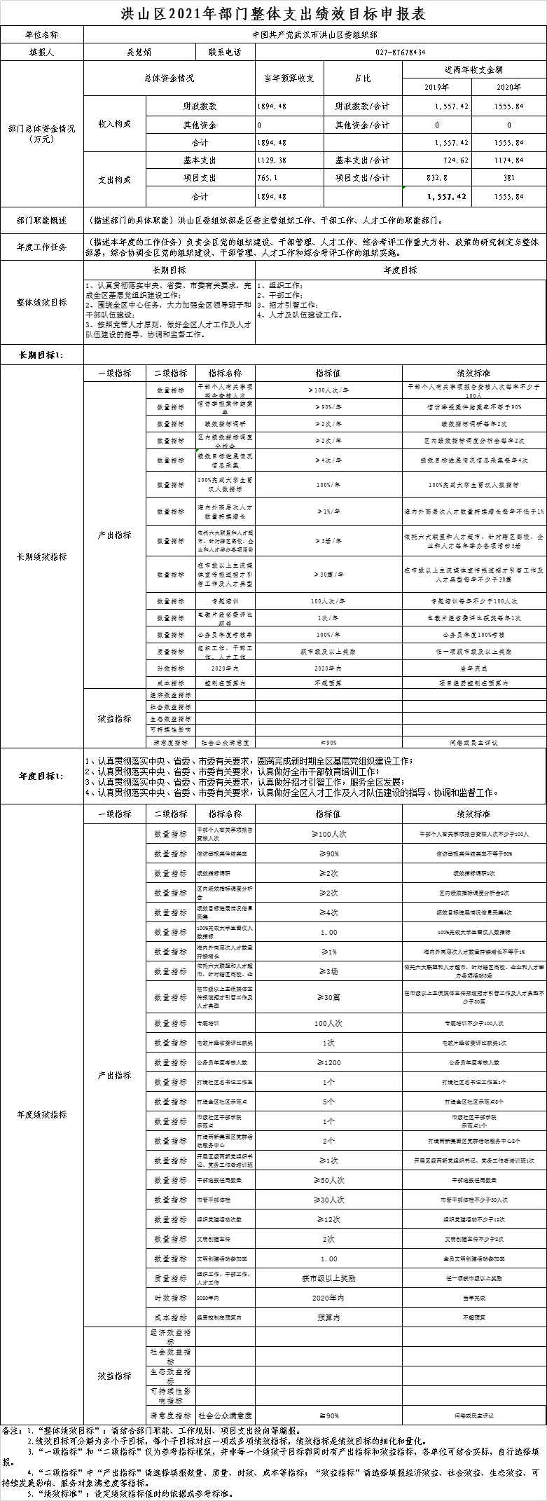 名 称:中国共产党武汉市洪山区委组织部2021年部门整体支出绩效目标申报表