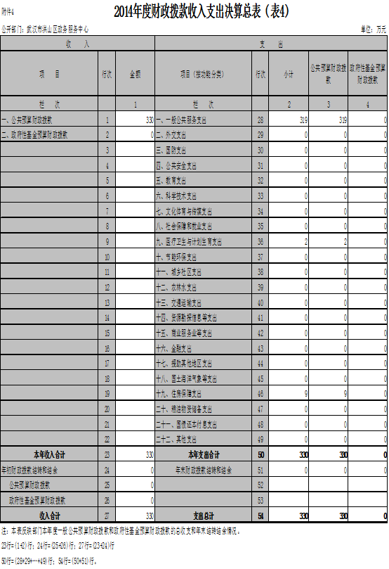 武汉市洪山区政务服务中心2014年度本年收入合计330万元。其中:财政拨款收入(含政府性基金拨款) 330万元,占本年收入100%。