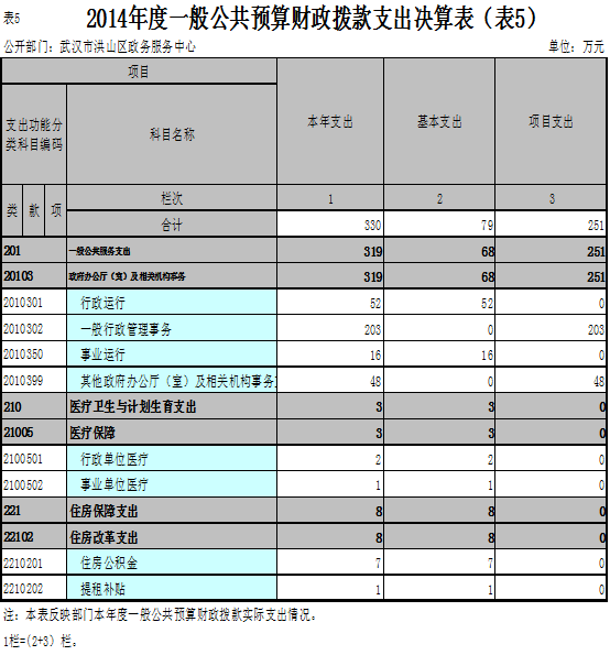 武汉市洪山区政务服务中心2014年一般公共预算财政拨款支出年度预算为330万元,包括年初部门预算、基本建设等专项资金、上级下达的专项转移支付资金及年初结转和结余资金等支出),支出决算为330万元,完成年度预算的100%。其中:基本支出79万元,主要是行政运行52万元,事业运行16万元,医疗卫生2万元,住房保障支出是9万元。项目支出251万元,项目支出主要用于窗口办公经费45.5万元,延时服务费114.6万元,购买劳务支出19.5万元,党建工作经费3万元,文明创建经费3万元,学习培训费3万元等。