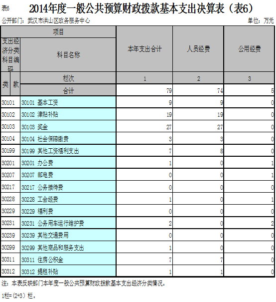 武汉市洪山区政务服务中心2014度一般公共预算财政拨款基本支出79万元,其中,人员经费74万元,主要包括:基本工资、津贴补贴、奖金、社会保障缴费、伙食补助费、绩效工资、其他工资福利支出、离休费、退休费、抚恤金、退职(役)费、抚恤金、生活补助、医疗费、助学金、资励金、住房公积金、提租补贴、购房补贴、其他对个人和家庭的补助支出;公用经费5万元,主要包括:办公费、印刷费、咨询费、手续费、水费、电费、邮电费、取暖费、物业管理费、差旅费、因公出国(境)费、专用维修(护)费、租赁费、会议费、培训费、公务接待费、专用材料费、被装购置费、专用燃料费、劳务费、委托业务费、工会经费、福利费、公务用车运行维护费、其他交通费用、税金及附加费用、其他商品和服务支出、办公设备购置、专用设备购置、信息网络及软件购置更新、其他资本性支出。