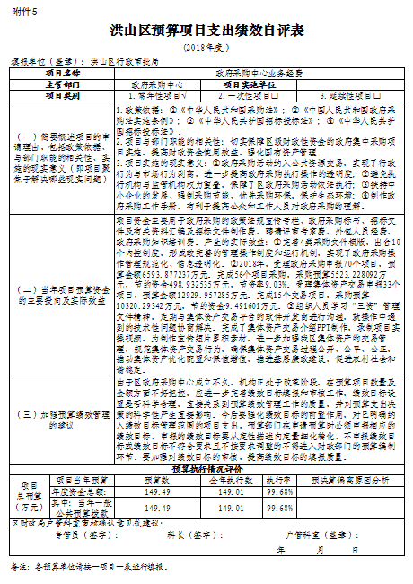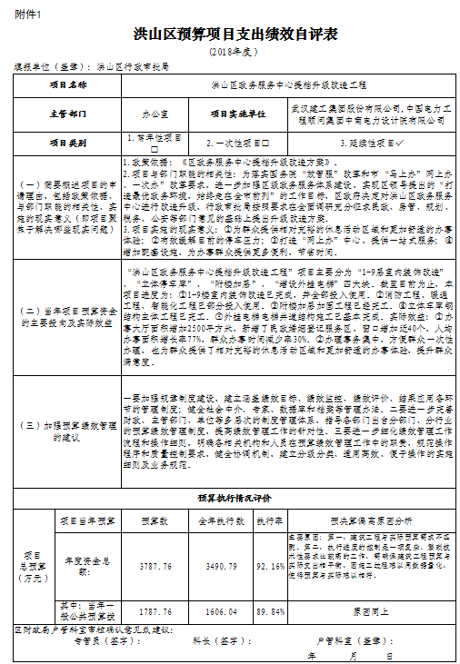 洪山区政务服务中心提档升级改造工程 项目绩效自评综述:项目全年预算数为 3787.76 万元,执行数为 3490.79 万元,完成预算的92.16 %。主要产出和效果:一是办事大厅面积增加2500平方米,新增了民政婚姻登记服务区,窗口增加近40个,人均办事面积增长率77%,群众办事时间减少率30%;二是办理事务集中,方便群众一次性办理,也为群众提供了相对充裕的休息活动区域和更加舒适的办事体验,提升群众满意度。发现的问题及原因:一是建筑工程与实际预算需求不匹配;二因施工过程难以用数据量化,使得预算与实际难以相符。下一步改进措施:一是进一步完善财政、主管部门、单位等多层次的制度管理体系,指导各部门出台分部门、分行业的预算绩效管理制度,提高绩效管理工作的针对性;二是进一步细化绩效管理工作流程和操作细则,明确各相关机构和人员在预算绩效管理工作中的职责,规范操作程序和质量控制要求,健全协调机制,建立分级分类、适用高效、便于操作的实施细则及业务规范。