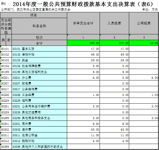 武汉市洪山区委区直属机关工作委员会2014度一般公共预算财政拨款基本支出190万元,其中,人员经费177万元,主要包括:基本工资、津贴补贴、奖金、社会保障缴费、伙食补助费、绩效工资、其他工资福利支出、离休费、退休费、抚恤金、退职(役)费、抚恤金、生活补助、医疗费、助学金、资励金、住房公积金、提租补贴、购房补贴、其他对个人和家庭的补助支出;公用经费13万元,主要包括:办公费、印刷费、咨询费、手续费、水费、电费、邮电费、取暖费、物业管理费、差旅费、因公出国(境)费、专用维修(护)费、租赁费、会议费、培训费、公务接待费、专用材料费、被装购置费、专用燃料费、劳务费、委托业务费、工会经费、福利费、公务用车运行维护费、其他交通费用、税金及附加费用、其他商品和服务支出、办公设备购置、专用设备购置、信息网络及软件购置更新、其他资本性支出。