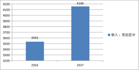 2017年度收、支总计4,160万元。与2016年相比,收、支总计各增加625万元,增长17.68%,主要原因是一般公共服务收入增加146万元、公共安全支出收入增加87万元、社会保障和就业支出收入增加184万元、医疗卫生与计划生育支出收入减少3万元、城乡社区支出收入增加181万元、商业服务等支出收入增加3万元、其他支出收入增加27万元。