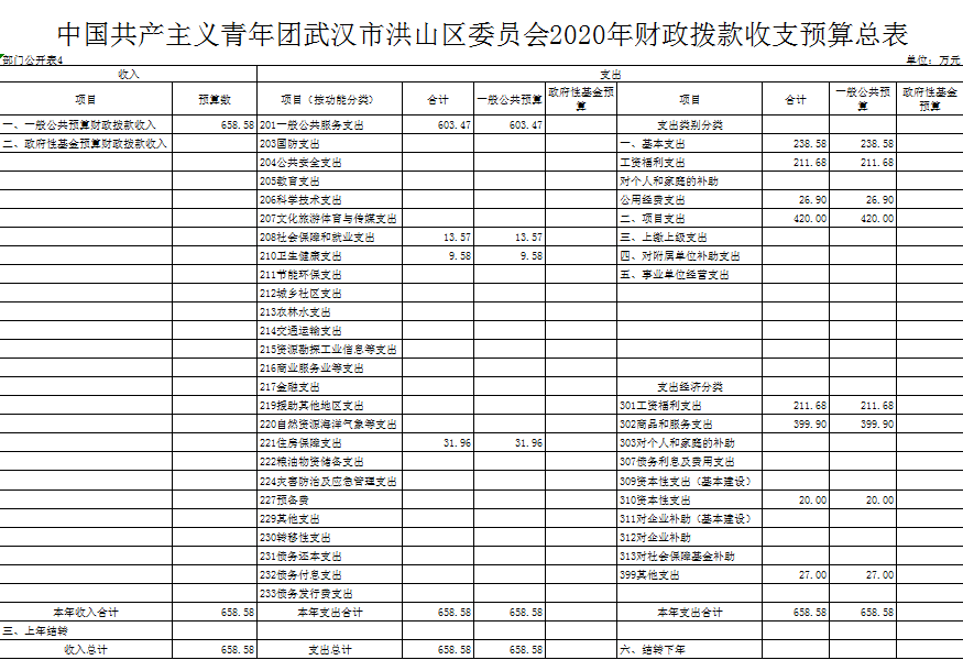 名 称:中国共产主义青年团武汉市洪山区委员会2020年财政拨款收支预算总表