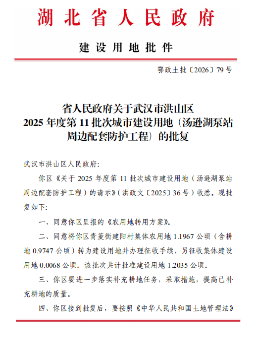 2.《省人民政府关于武汉市洪山区2025年度第 11批次城市建设用地(汤逊湖泵站周边配套防护工程)》(鄂政土批〔2026〕79 号)