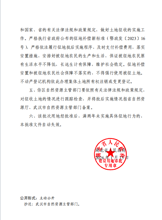 根据《省人民政府关于武汉市洪山区2025年度第 11批次城市建设用地(汤逊湖泵站周边配套防护工程)》(鄂政土批〔2026〕79 号)文件,湖北省(武汉市)人民政府已经批准同意洪山区人民政府对汤逊湖泵站周边配套防护工程项目涉及的集体土地办理征收和农用地转用手续。现将有关事项公告如下: