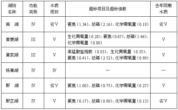 本次监测的6个湖泊中,符合湖泊功能区类别的湖泊有1个。1现状呈Ⅳ类水体的湖泊有1个,现状呈Ⅴ类水体的湖泊有3个,现状呈劣Ⅴ类水体的湖泊有2个。
