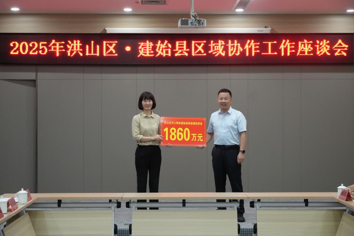 纪宏杰副区长介绍了2025年区域协作结对帮扶工作进展情况,建始县汇报了2021年以来巩固拓展脱贫攻坚成果同乡村振兴有效衔接及区域协作工作推进情况。会议现场举行了两项重要捐赠仪式:洪山区向建始县捐赠1860万元结对帮扶财政援助资金,马应龙药业集团向建始县捐赠价值50万元大健康产品。