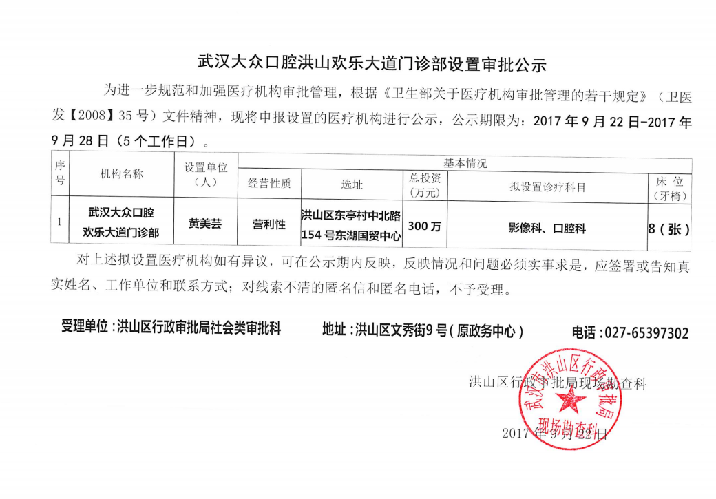 武汉大众口腔洪山欢乐大道门诊部设置审批公示