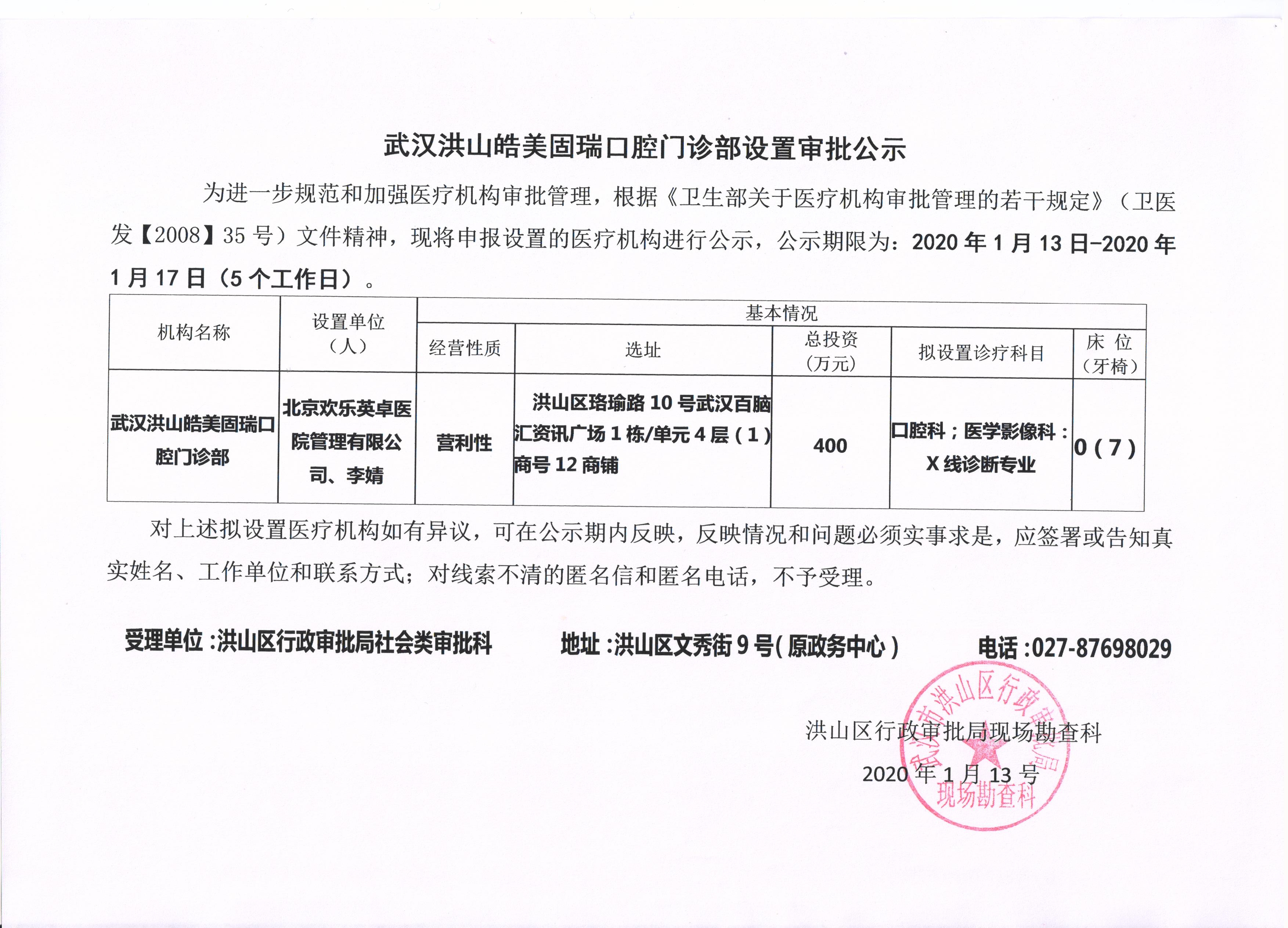 为进一步规范和加强医疗机构审批管理,根据《卫生部关于医疗机构审批管理的若干规定》(卫医发【2008】35号)文件精神,现将申报设置的医疗机构武汉洪山皓美固瑞口腔门诊部设置审批进行公示,拟设立选址洪山区珞瑜路10号武汉百脑汇资讯广场1栋/单元4层(1)商号12商铺;拟设置诊疗科目口腔科;医学影像科:X线诊断专业;公示期限为2020年1月13日-2020年1月17日(5个工作日)。