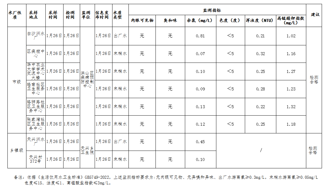 标     题 洪山区生活饮用水 2026年1月26日监测结果