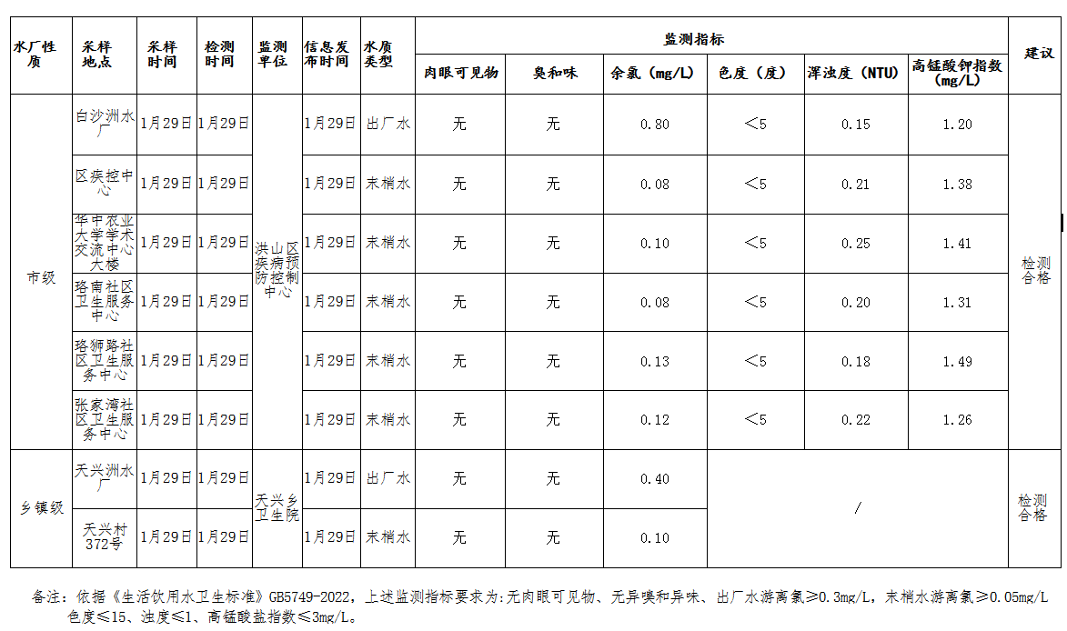 标     题 洪山区生活饮用水 2026年1月29日监测结果