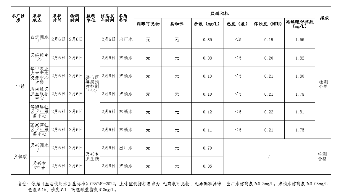 标     题 洪山区生活饮用水 2026年2月6日监测结果