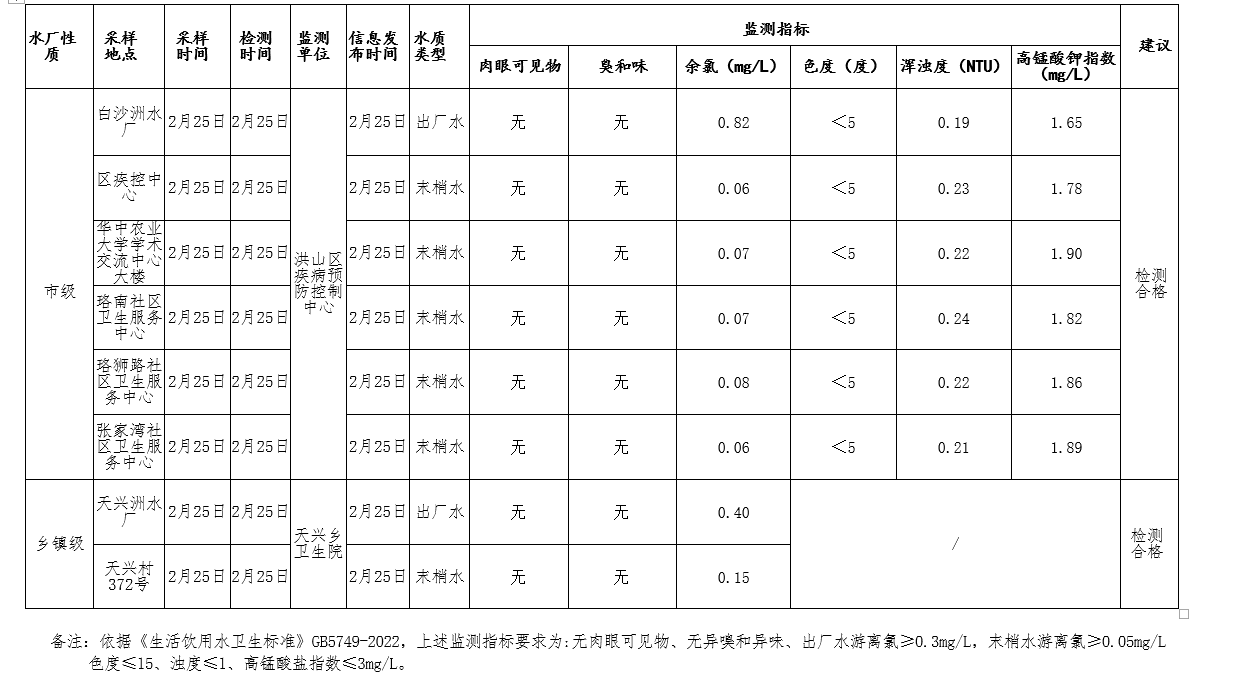 标     题 洪山区生活饮用水 2026年2月25日监测结果
