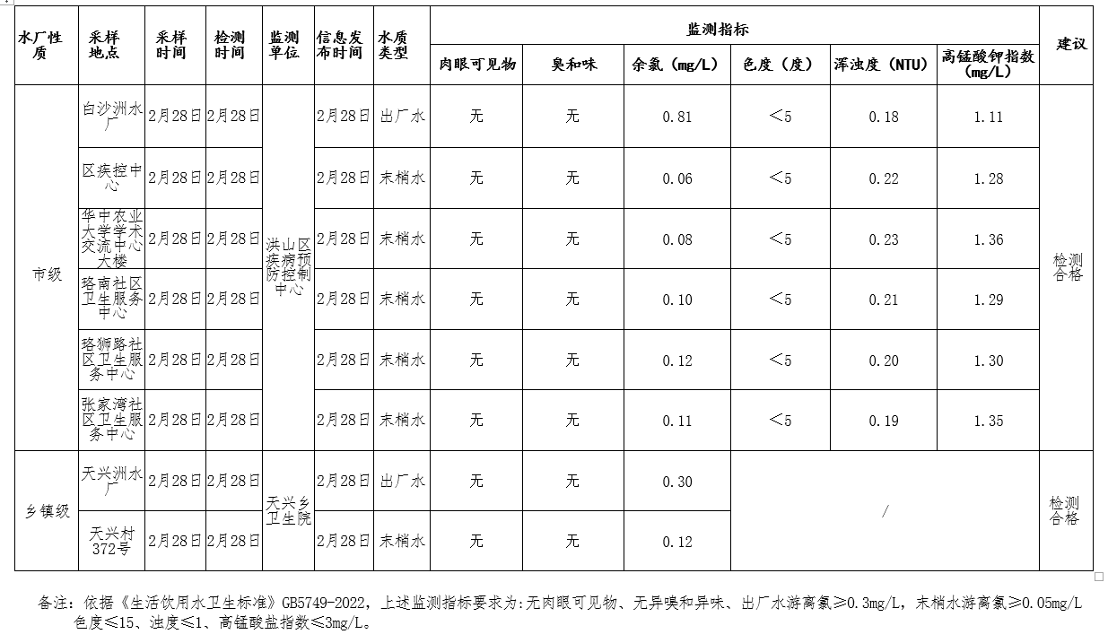 标     题 洪山区生活饮用水 2026年2月28日监测结果