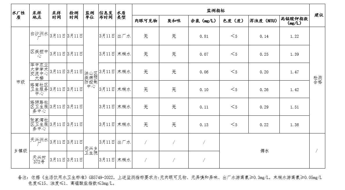 标     题 洪山区生活饮用水 2026年3月11日监测结果